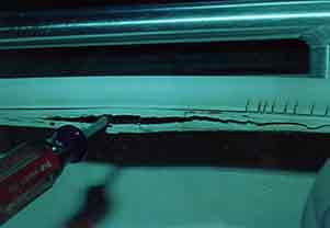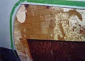 Во-первых , он впитывает воду , как губка . У небольших лодок отродясь не было проблемы пузырения гелькоата до тех пор , пока не пришли материалы , подобные этому. Теперь их пучит как лодки тайваньского производства , сделанные из рубленого волокна . Во-вторых , очень тонкий заполнитель , подобный этому , не создает эффекта конструкции фермы , что должен делать настоящий заполнитель. Заполнитель увеличивает прочность за счет разнесения нагрузки между внутренним и наружным слоями стеклопластика. Представьте себе , что он выступает в качестве балок , а заполнитель - в роли опор . Конструкция в точности похожа на ферму , поддерживающую крышу. Но только не в случае использования тонкого листа вроде этого. Итог этого - замена прочного материала на слабый. Возьмите обычное круизное судно с применением такого рода материала в стенах рубки и покрасьте их в черный цвет. Оставьте под жарким южным солнцем на пару лет и понаблюдайте , что происходит. Проклятие ! Они покоробились и растрескались. Хотите знать почему ? Или же вы хотите знать , почему на фирме- изготовителе не знали , что такое произойдет ? И вообще , было ли им до этого . Да нет , они просто этого не знали , потому как в штате у них не было инженера по композитам. Материал для них придумали маркетологи , а на фирме были рады по уши , что удалось на этом сэкономить и теперь гордо называть это "хай-теком". А то , что произошло , называется тепловой деформацией. В каждой своей точке слоеная конструкция является жесткой , как , например , вокруг иллюминатора , закрепленного винтами . Но когда материал начинает расширяться , его удерживают рама и крепеж . Поэтому ничего другого ему не остается , кроме как коробиться и трескаться.
