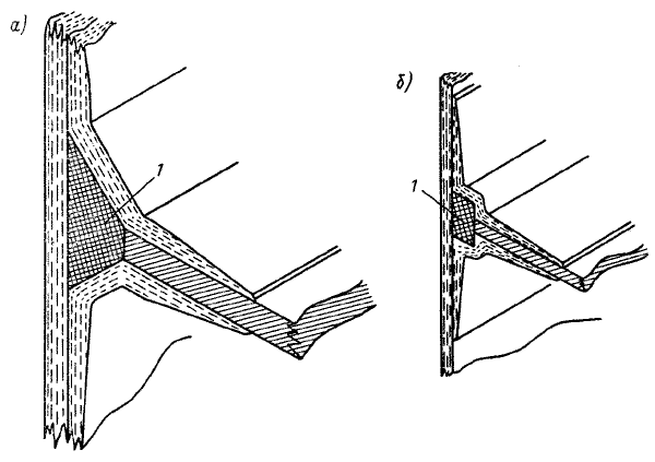 б - ребро жесткости, отформованное за одно целое (внизу) и приформованное (вверху);