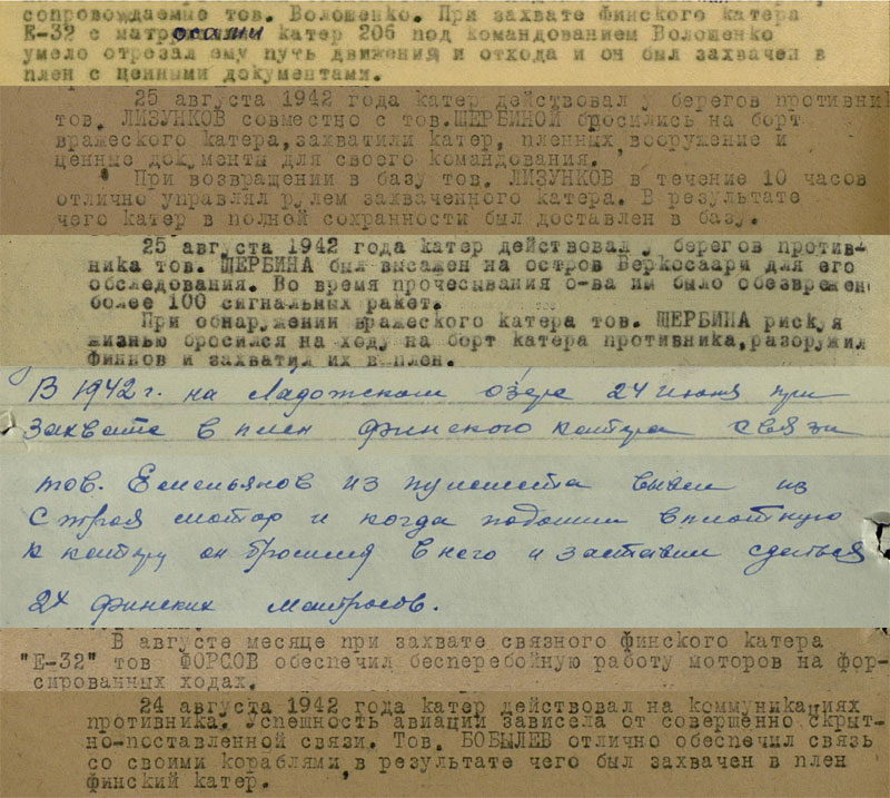 Командующий Ладожской флотилией В.С.Чероков объявил всему личному составу «морских охотников» благодарность, а особо отличившиеся получили правительственные награды. Выписки из наградных листов отличившихся при захвате катера Е-32 Источник : http://podvignaroda.ru
