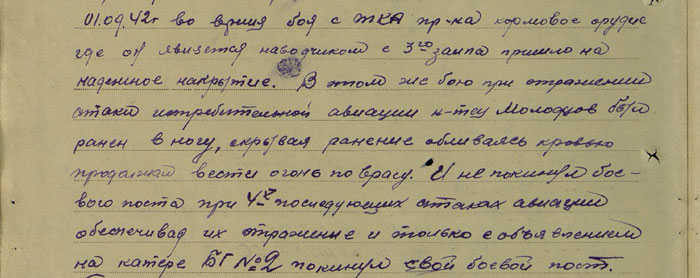 От зажигательных пуль в кубрике возник пожар. Обнаружил его раненый матрос Степанов. Истекая кровью, он приполз по палубе к командиру и доложил об -этом. Будучи не в силах помочь товарищам, бросившимся тушить огонь, он остался вместо вахтенного сигнальщика, помогая артиллеристам и пулеметчикам своевременно обнаруживать воздушных хищников. Отразив атаки фашистских самолетов, наши катера возвратились в базу.